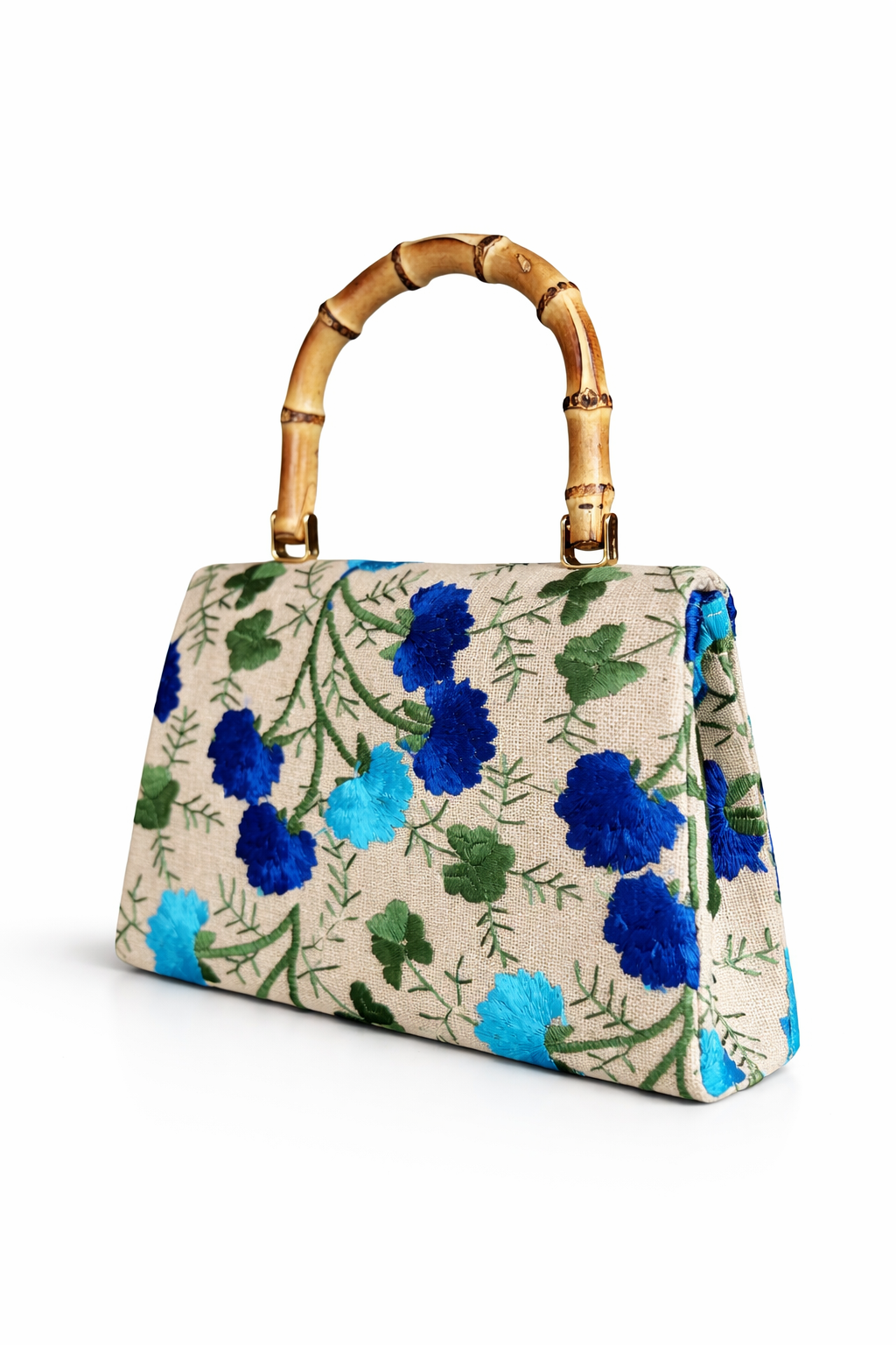 The Palms Bamboo Mini Bag blends timeless structure with tropical elegance. Crafted on a durable canvas base, this piece is elevated by intricate woven floral embroidery, creating rich texture and depth against its neutral backdrop.